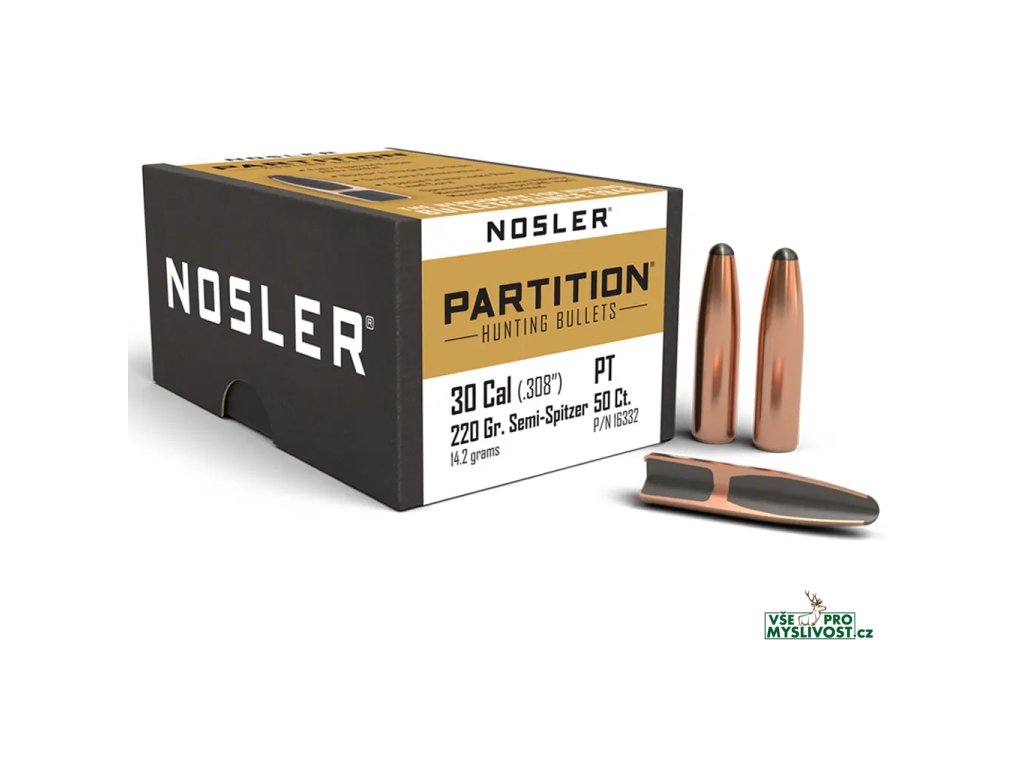 Střely Nosler Partition .30 cal, dia .308, 220grs (14,2g). SKU: 16332