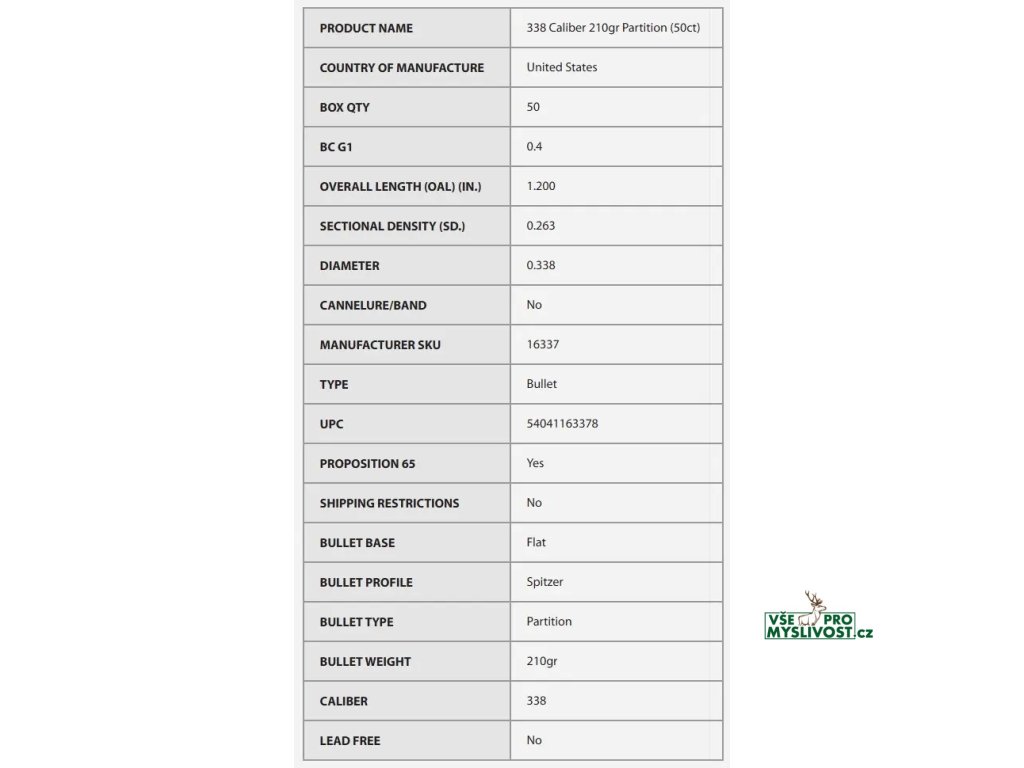 Střely Nosler Partition .338 Cal, dia .338, 210grs (13,6g). SKU: 16337