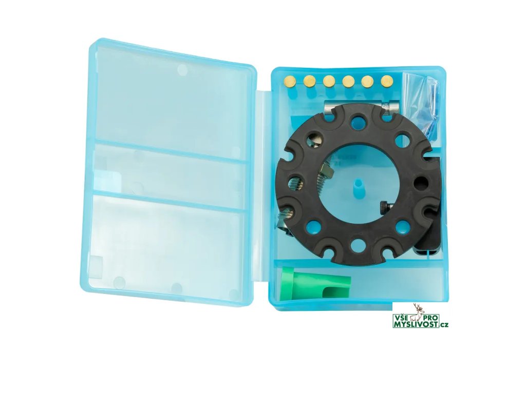 Sada pro výměnu ráží lisu. Obsahuje Shellpate (držák nábojnic), prachovací matrici a další potřebné díly, upravené pro zvolenou ráži.