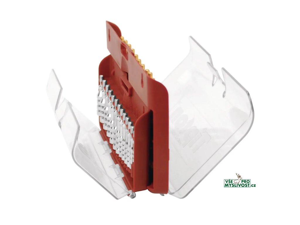 Sada je přehledně uložena v odolné plastové krabičce s víkem a označenými přihrádkami, takže správný jag nebo kartáček vyberete snadno a rychle.