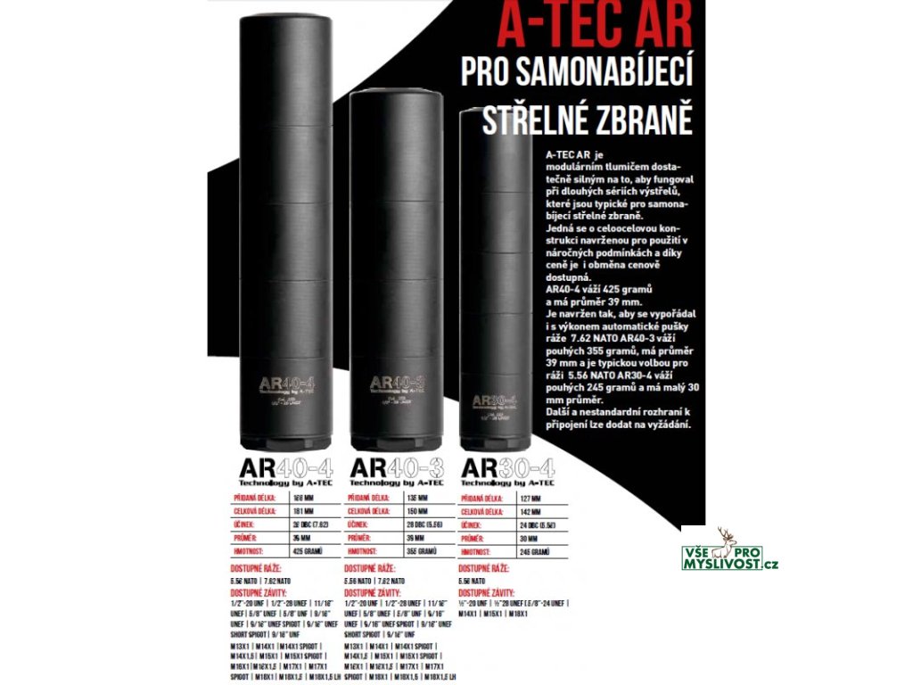 A-TEC AR - kompletní popis technická data, seznam ráží a systémů upnutí v katalogu A-TEC v Českém jazyce ke stažení na našich stránkách. Tlumiče vyrobeny pro moderní samonabíjecí pušky, kde je předpoklad vyšší zátěže intenzivní střelbou v samonabíjecím režimu, než je tomu např. při lovu. Především jsou určeny pro zbraně typu AR-15/MSR-15 a AR-10/MSR-10 apod. Model AR40-3 se závitem M14x1 je vhodný např. pro civilní varianty pušky vz.58 Tyto tlumiče budou nabízeny s příslušnými závity i pro pušky Bren 2, AUG atd.. Modulové tlumiče se všemi výhodami snažší údržby a čištění