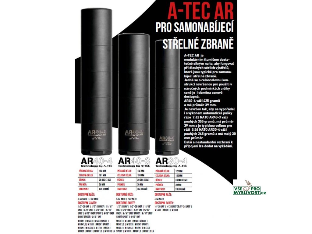 A-TEC AR - kompletní popis technická data, seznam ráží a systémů upnutí v katalogu A-TEC v Českém jazyce ke stažení na našich stránkách. Tlumiče vyrobeny pro moderní samonabíjecí pušky, kde je předpoklad vyšší zátěže intenzivní střelbou v samonabíjecím režimu, než je tomu např. při lovu. Především jsou určeny pro zbraně typu AR-15/MSR-15 a AR-10/MSR-10 apod. Model AR40-3 se závitem M14x1 je vhodný např. pro civilní varianty pušky vz.58 Tyto tlumiče budou nabízeny s příslušnými závity i pro pušky Bren 2, AUG atd.. Modulové tlumiče se všemi výhodami snažší údržby a čištění Není vhodné při použití střeliva subsonic s těžkými střelami, např. u .300 AAC Blackout!!