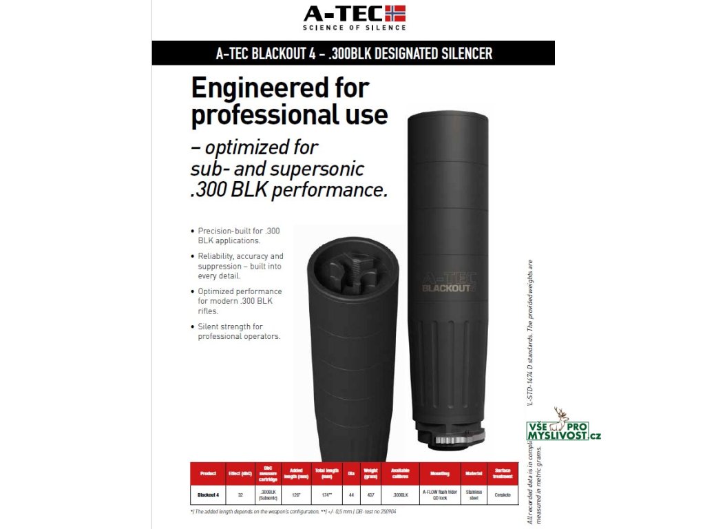 A-TEC Blackout 4 32 představuje ideální volbu pro moderní pušky v ráži .300 BLK, kde je vyžadována kombinace tichého výkonu, odolnosti a rychlé montáže.