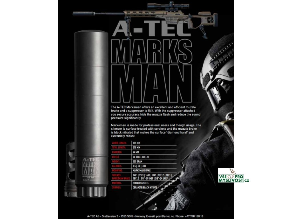 A-TEC Marksman Novinka pro profesionální využití, především u ostřelovacích pušek. Upínání přes unikátní úsťovou brzdu, která není v ceně! Všechny výhody modulového tlumiče, snažší údržba, čištění atd. Tlumič přidává na délce pouze 155mm Útlum je redukovaný o 30 dBC v ráži .338 Lapua Mag !