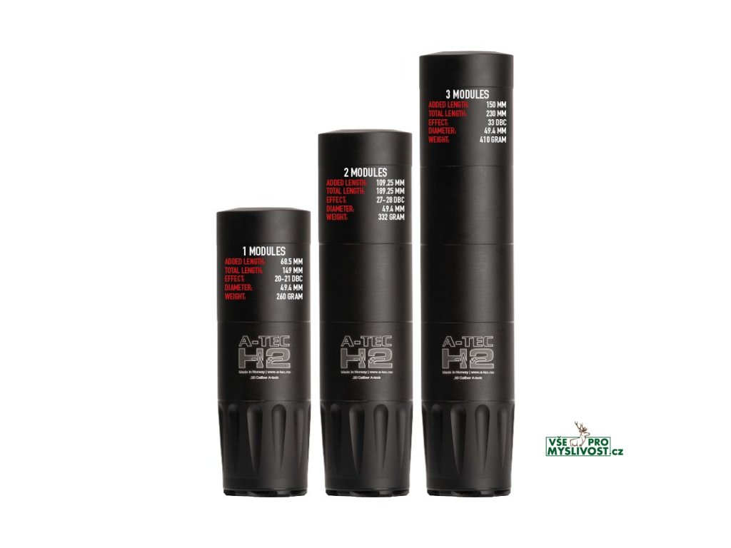 A-TEC H2 a H2 Mega - kompletní popis technická data, seznam ráží a systémů upnutí v katalogu A-TEC v Českém jazyce ke stažení na našich stránkách. Bezkonkurenčně nejžádanější a nejprodávanější model. H2 je modulový tlumič, který je určen pro opakovací, samonabíjecí, lovecké a sportovní zbraně bez předních mířidel. Jde 8cm zpět přes hlaveň a přidává pouze 15cm se všemi 3 moduly k celkové délce zbraně! Jednotlivé moduly lze jednoduše odebírat a docílit tak ještě kompaktnějšího setu zbraně a tlumiče, což může být výhodné např. při naháňkách, dosledech, čištění a údržbě. Model H2 Mega je pouze větší a je určen pro lepší účinek např. u ráží magnum apod. https://www.youtube.com/watch?v=joO_XDBxwOA