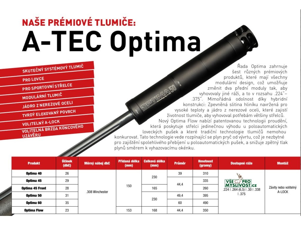 A-TEC Optima představuje rodinu modulárních tlumičů navržených pro moderní lovecké a sportovní zbraně. Nízká hmotnost, výkonné vnitřní jádro a vyměnitelné přední moduly umožňují jeden tlumič použít pro různé ráže. Varianta Optima Flow s technologií A-FLOW je speciálně vytvořena pro samonabíjecí pušky a výrazně snižuje blow-back plynů do závěru.
