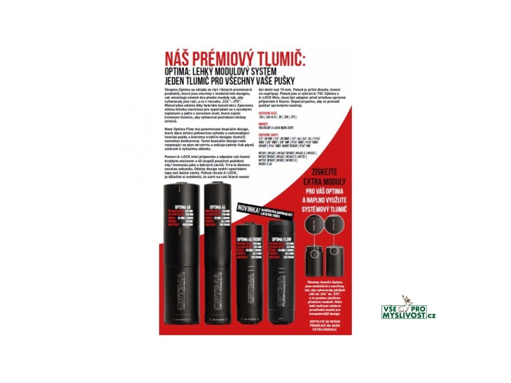 Řada A-TEC Optima zahrnuje modely Optima 60, Optima 50 a Optima 45 (určené pro opakovací i samonabíjecí zbraně bez předních mířidel), dále Optima Front (pro zbraně s pevnými mířidly) a Optima Flow (se sníženým protitlakem pro samonabíjecí lovecké a sportovní zbraně). Všechny modely využívají výměnný přední modul, takže můžete mít jeden tlumič a jen měnit modul podle ráže.