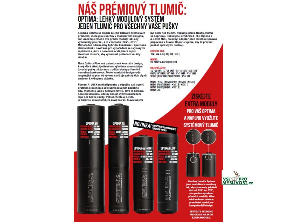 A-TEC Optima - kompletní popis technická data, seznam ráží a systémů upnutí v katalogu A-TEC v Českém jazyce ke stažení na našich stránkách. Modely Optima 60 a 45 jsou určeny pro lovecké a sportovní opakovací, samonabíjecí zbraně, bez předních mířidel. Tlumič jde o 8cm zpět přes hlaveň a přidává tak pouze 15cm k celkové délce zbraně. Přední modul tlumiče je výměnný a lze tak mít jeden tlumič s výměnou sadou modulů pro různé ráže. Model Optima Front je určen pro zbraně s předními mířidly a celou svojí délkou jde dopředu před ústí, opět lze měnit přední modul za modul pro jiné ráže Model Optima Flow je určen speciálně pro samonabíjecí lovecké a sportovní zbraně. Technologie A-FLOW snižuje tlak a tok plynů zpět směrem k výchozímu okénku zbraně. Nejde zpět přes hlaveň a lze měnit přední modul