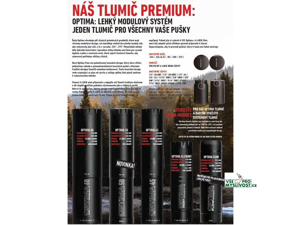 A-TEC Optima - kompletní popis technická data, seznam ráží a systémů upnutí v katalogu A-TEC v Českém jazyce ke stažení na našich stránkách. Modely Optima 60 a 45 jsou určeny pro lovecké a sportovní opakovací, samonabíjecí zbraně, bez předních mířidel. Tlumič jde o 8cm zpět přes hlaveň a přidává tak pouze 15cm k celkové délce zbraně. Přední modul tlumiče je výměnný a lze tak mít jeden tlumič s výměnou sadou modulů pro různé ráže. Model Optima Front je určen pro zbraně s předními mířidly a celou svojí délkou jde dopředu před ústí, opět lze měnit přední modul za modul pro jiné ráže Model Optima Flow je určen speciálně pro samonabíjecí lovecké a sportovní zbraně. Technologie A-FLOW snižuje tlak a tok plynů zpět směrem k výchozímu okénku zbraně. Nejde zpět přes hlaveň a lze měnit přední modul