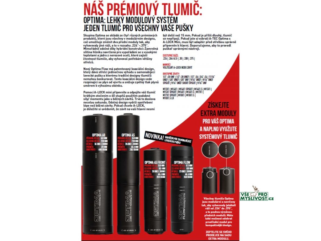 A-TEC Optima - kompletní popis technická data, seznam ráží a systémů upnutí v katalogu A-TEC v Českém jazyce ke stažení na našich stránkách. Modely Optima 60 a 45 jsou určeny pro lovecké a sportovní opakovací, samonabíjecí zbraně, bez předních mířidel. Tlumič jde o 8cm zpět přes hlaveň a přidává tak pouze 15cm k celkové délce zbraně. Přední modul tlumiče je výměnný a lze tak mít jeden tlumič s výměnou sadou modulů pro různé ráže. Model Optima Front je určen pro zbraně s předními mířidly a celou svojí délkou jde dopředu před ústí, opět lze měnit přední modul za modul pro jiné ráže Model Optima Flow je určen speciálně pro samonabíjecí lovecké a sportovní zbraně. Technologie A-FLOW snižuje tlak a tok plynů zpět směrem k výchozímu okénku zbraně. Nejde zpět přes hlaveň a lze měnit přední modul