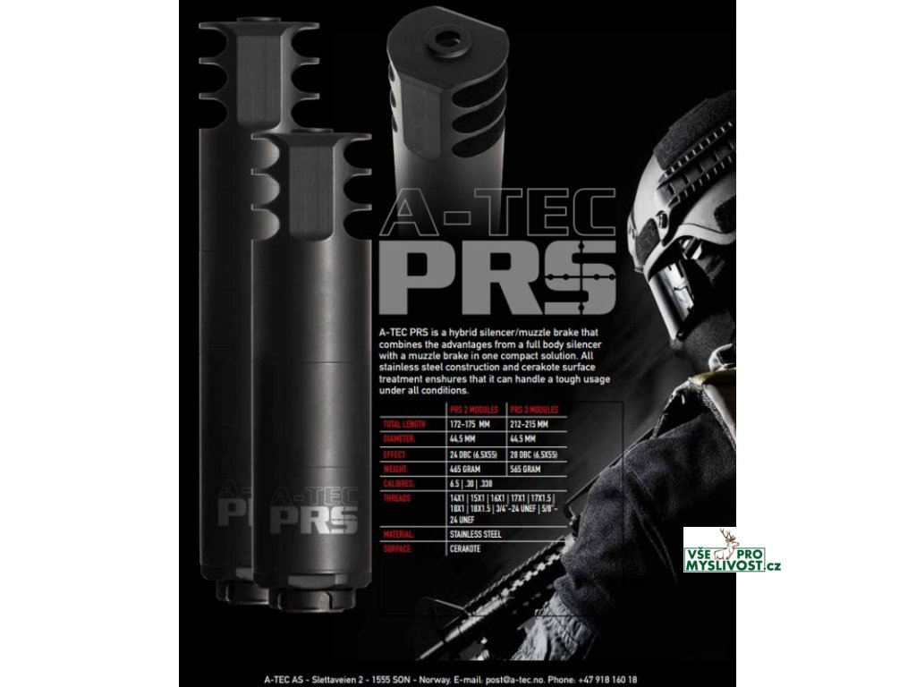 Tlumič A-TEC, PRS3, mod., hybridní s úsťovou brzdou, ráže do 338" (8,5mm) na závit M18x1mm