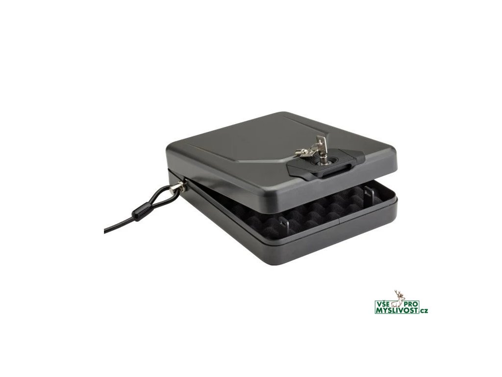 Patentovaný mechanismus dvojité příčné závory poskytuje nejlepší zabezpečení ve své třídě. PEVNÁ KONSTRUKCE Robustní ocelové pouzdro o průměru 1,3 mm / 16 odporových jednotek s bezpečnostním pásem odolným proti otěru a zámkem s válcovým klíčem zajišťují zabezpečení proti neoprávněné manipulaci. INOVATIVNÍ KABELOVÝ DESIGN Součástí je ocelový, bezpečnostní kabel který odolá do 680kg. Tento patentovaný kabelový system umožňuje využít maximální úložný prostor. PŘEVYŠUJE ASTM BEZPEČNOSTNÍ STANDARDY Překračuje bezpečnostní normy ASTM International a CA DOJ pro bezpečnost dětí a odolnost proti páčení, pevnost zámku, testy pádu/vyzvednutí/pilování a odolnost pantů. Určený pro pistole o velikosti 1911 a 4-palcové revolvery.* Vnějšek: 26,0 x 20,3 x 7,0 cm Vnitřek: 24,8 x 19,0 x 5,7 cm