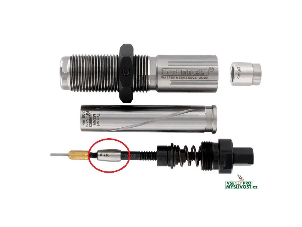 Velmi přesný, vyměnitelný vnitřní krčkový kalibr (expandér) je vyroben z kalené, jemně broušené nástrojové oceli, což zajišťuje dlouhou životnost a přesnost při přebíjení.
