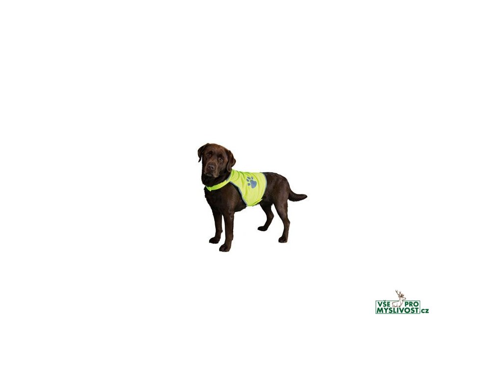 Vesta je neonově žlutá a má ještě reflexní okraje a tlapku. Použití reflexní vesty při venčení výrazně zvyšuje bezpečnost vašeho pejska.
