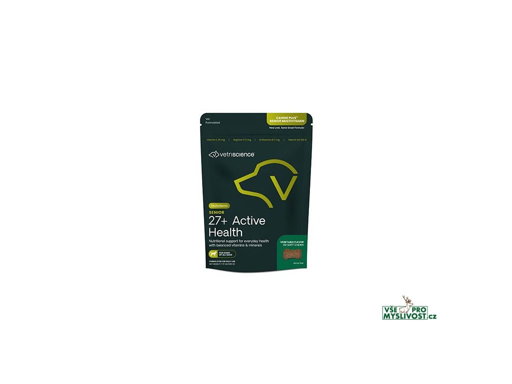 Žvýkací pamlsek VetriScience Senior 27+Active Health Multivitamin obsahuje speciální recepturu, která se zaměřuje na geriatrické psy kombinující vyváženost vitamínů, minerálních látek, esenciálních mastných kyselin, antioxidantů a dalších faktorů, které synergicky podporuj kardiovaskulární systém, játra, mozkovou činnost, oči, klouby a trávicí systém. A také udržují psychické a mentální zdraví stárnoucích psů.VetriScience Senior 27+Active Health Multivitamin je doporučen pro geriatrické psy na podporu funkce srdce, jater, mozku a očí, stejně jako pro jejich fyzickou a duševní pohodu.