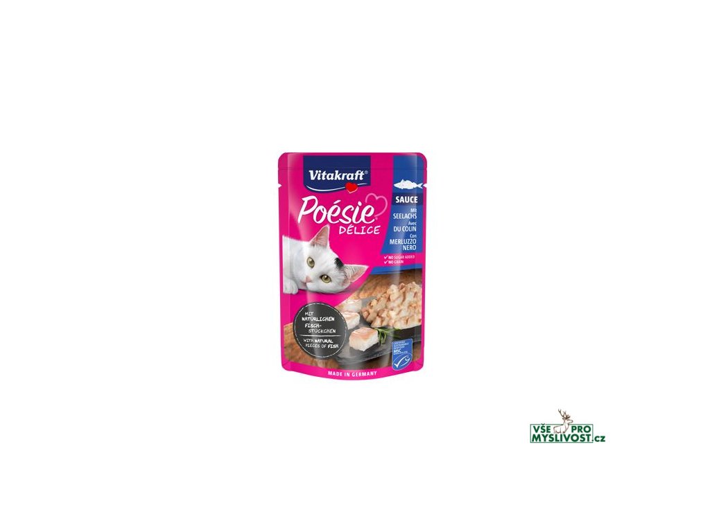 Poésie Délice Sauce s masem tresky tmavé od značky Vitakraft – kompletní mokré krmivo pro dospělé jedince. Kapsička potěší vašeho mazlíčka, ať už je jakéhokoliv plemena či velikosti. Uvnitř nenajdete žádný cukr, ani obiloviny. Zato obsahuje poctivou porci kousků šťavnatého masa a minerálních látek. Díky lahodné omáčce zachutná každé kočce.