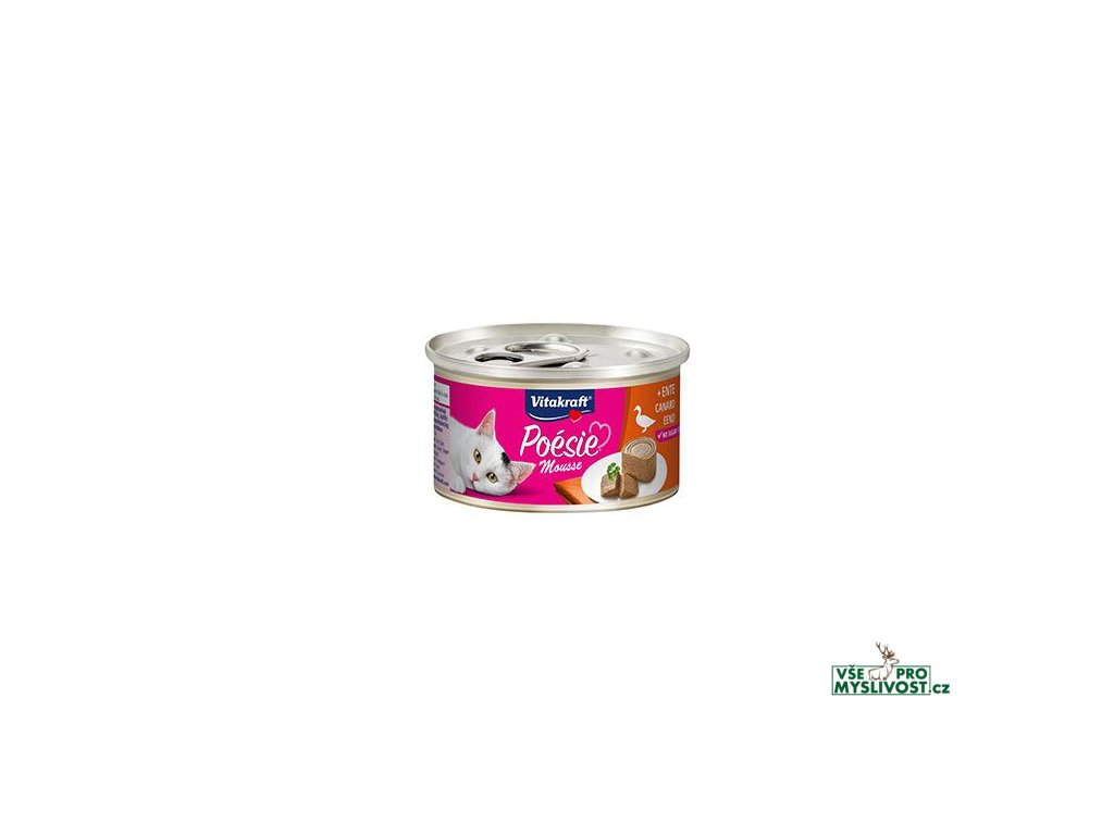 Poésie Mousse od značky Vitakraft – kompletní krmivo s kachní příchutí pro dospělé jedince všech velikostí a plemen. Uvnitř konzervičky čeká paštika ve formě delikátní pěny, která zachutná každé kočce. Je vyrobená z masa a obsahuje minerální látky. Nenajdete v ní žádný cukr, umělá barviva, ani obiloviny. Dopřejte svému mazlíčkovi po dni plném dobrodružství to nejlepší!