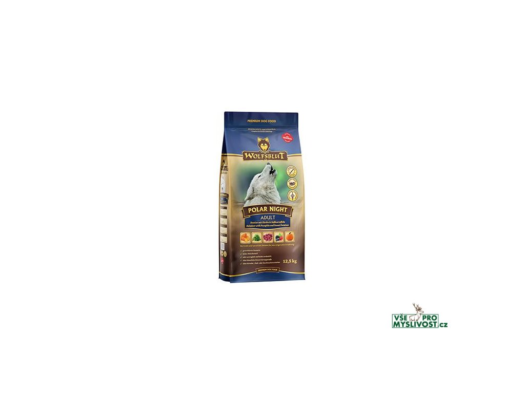 Vlci loví svou kořist od Skalistých hor Severní Ameriky, arktické tundry, hor a lesů Evropy až po pouště a stepi střední Asie. To jim dodává maso a vnitřnosti bohaté na živiny, ale také zeleninu, ovoce, bobule, kořeny a bylinky z obsahu žaludku kořisti. Obilí zde není zahrnuto. Vlk tak přijímá potřebné vitamíny, minerály, stopové prvky, enzymy a druhotné rostlinné látky. Vzhledem k tomu, že vlk je předkem všech psů, naše suché krmivo pro psy Wolfsblut je založeno na přirozených stravovacích návycích vlka. Obsahuje hodně masa nebo ryb v kombinaci se superpotravinami, které obsahují hodnotné ingredience – stejně jako v přírodě, bez obilovin. Náš výběr výjimečných druhů masa a superpotravin bohatých na živiny vychází z vlčích biotopů a jejich pestré stravy. Wolfsblut nabízí každému psovi druhově vhodnou a originální stravu a díky rozmanitosti odrůd si každý najde něco, co snese. Receptura suchého krmiva POLAR NIGHT ADULT kombinuje výživu vlků s nejnovějšími vědeckými poznatky o správné výživě psů.