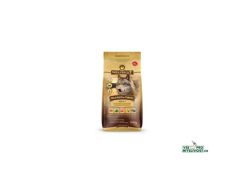 Vlci loví svou kořist od Skalistých hor Severní Ameriky, arktické tundry, hor a lesů Evropy až po pouště a stepi střední Asie. To jim dodává maso a vnitřnosti bohaté na živiny, ale také zeleninu, ovoce, bobule, kořeny a bylinky z obsahu žaludku kořisti. Obilí zde není zahrnuto. Vlk tak přijímá potřebné vitamíny, minerály, stopové prvky, enzymy a druhotné rostlinné látky. Vzhledem k tomu, že vlk je předkem všech psů, naše suché krmivo pro psy Wolfsblut je založeno na přirozených stravovacích návycích vlka. Obsahuje hodně masa nebo ryb v kombinaci se superpotravinami, které obsahují hodnotné ingredience – stejně jako v přírodě, bez obilovin. Náš výběr výjimečných druhů masa a superpotravin bohatých na živiny vychází z vlčích biotopů a jejich pestré stravy. Wolfsblut nabízí každému psovi druhově vhodnou a originální stravu a díky rozmanitosti odrůd si každý najde něco, co snese. Receptura suchého krmiva WILD DUCK & TURKEY kombinuje výživu vlků s nejnovějšími vědeckými poznatky o správné výživě psů.