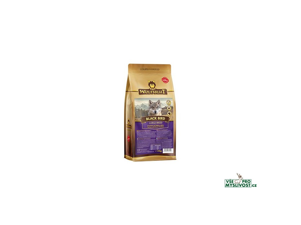 Vlci loví svou kořist od Skalistých hor Severní Ameriky, arktické tundry, hor a lesů Evropy až po pouště a stepi střední Asie. To jim dodává maso a vnitřnosti bohaté na živiny, ale také zeleninu, ovoce, bobule, kořeny a bylinky z obsahu žaludku kořisti. Obilí zde není zahrnuto. Vlk tak přijímá potřebné vitamíny, minerály, stopové prvky, enzymy a druhotné rostlinné látky. Vzhledem k tomu, že vlk je předkem všech psů, naše suché krmivo pro psy Wolfsblut je založeno na přirozených stravovacích návycích vlka. Obsahuje hodně masa nebo ryb v kombinaci se superpotravinami, které obsahují hodnotné ingredience – stejně jako v přírodě, bez obilovin. Náš výběr výjimečných druhů masa a superpotravin bohatých na živiny vychází z vlčích biotopů a jejich pestré stravy. Wolfsblut nabízí každému psovi druhově vhodnou a originální stravu a díky rozmanitosti odrůd si každý najde něco, co snese. Receptura suchého krmiva BLACK BIRD LARGE BREED kombinuje výživu vlků s nejnovějšími vědeckými poznatky o správné výživě psů.