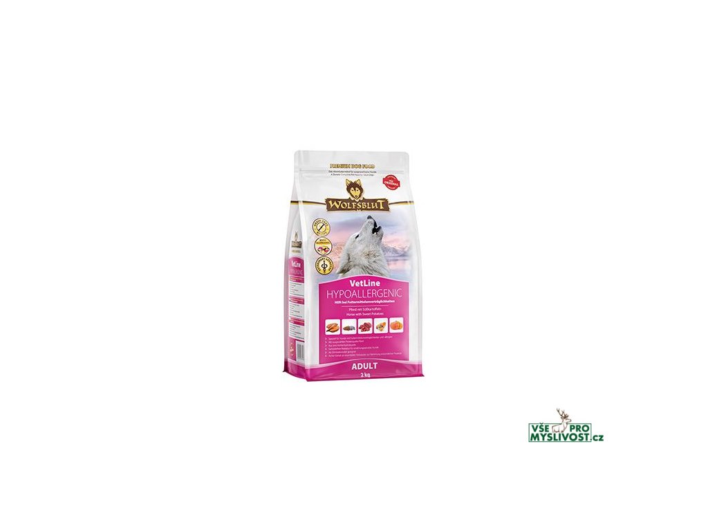 WOLFSBLUT VetLine HYPOALLERGENIC je kompletní dietní krmivo pro dospělé psy ke snížení příznaků intolerance surovin a živin v souvislosti s chronickým svěděním, zánětem vnějšího ucha a gastrointestinálními onemocněními, jako je IBD (zánětlivé onemocnění střev) nebo kolitida.
