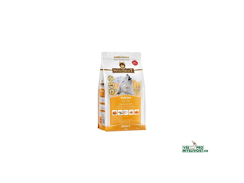 WOLFSBLUT VetLine SKIN je kompletní dietní krmivo pro dospělé psy pro podporu funkce kůže při dermatóze a nadměrném vypadávání srsti a pro snížení příznaků intolerance surovin a živin v souvislosti s chronickým svěděním, zánětem vnějšího ucha a gastrointestinálními onemocněními.